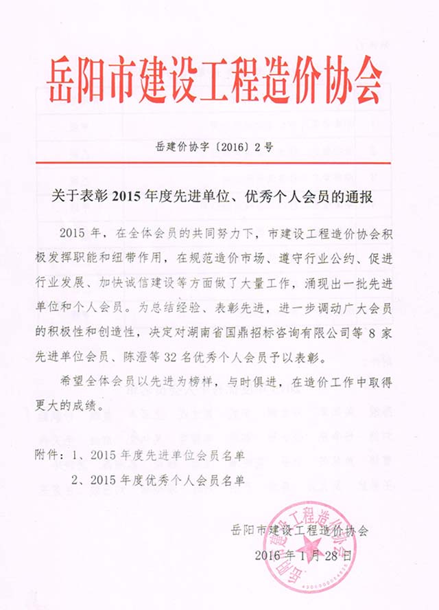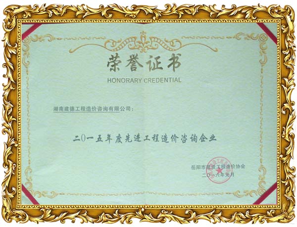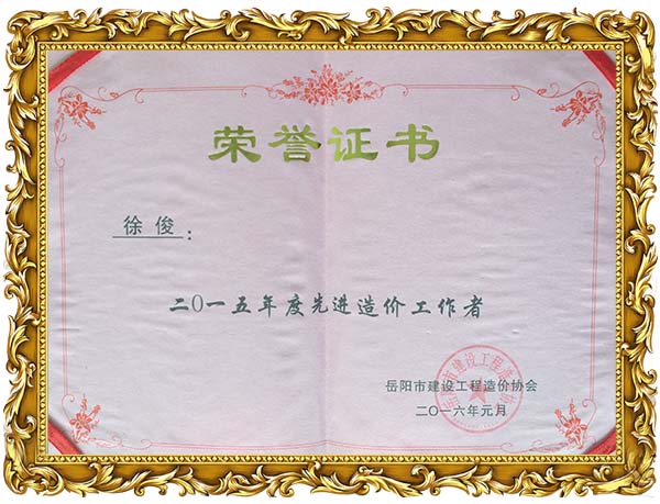 我公司榮獲2015年度岳陽(yáng)市工程造價(jià)協(xié)會(huì)先進(jìn)單位榮譽(yù),同時(shí)徐俊,倪娟榮獲岳陽(yáng)市造價(jià)協(xié)會(huì)2015年度優(yōu)秀個(gè)人榮譽(yù)。